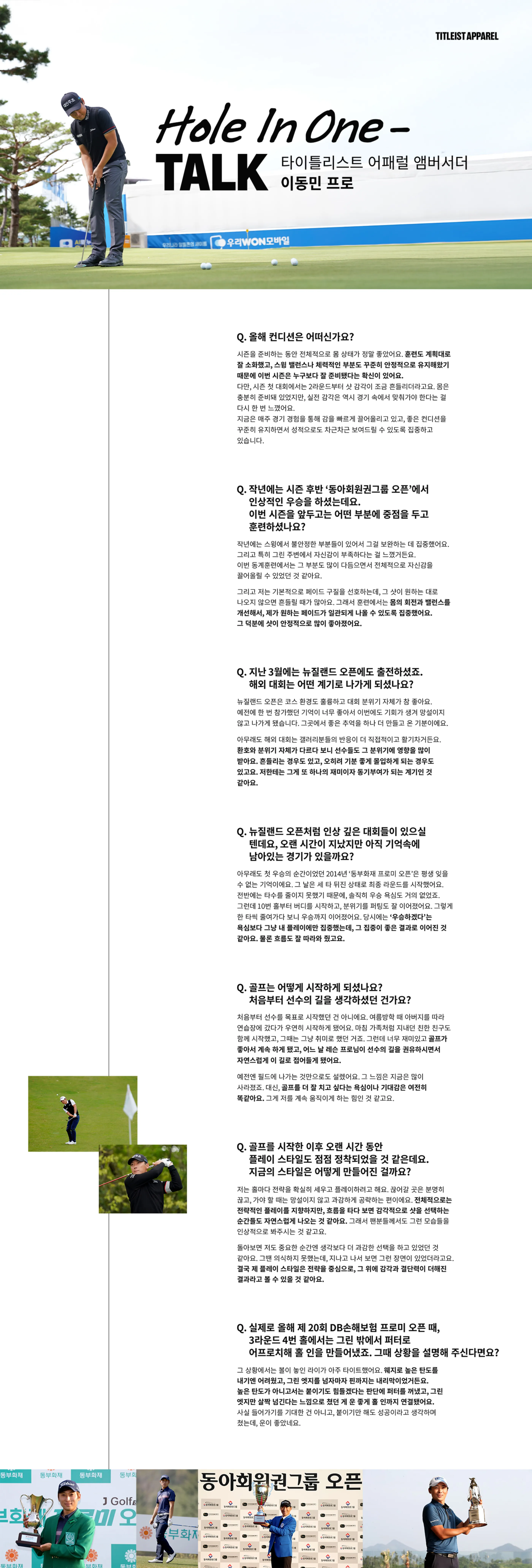 무엇보다도 ‘골퍼 입장에서 정말 필요한 부분들을 잘 알고 만든다’는 느낌이 들어서 신뢰하고 있어요. 요즘 골프웨어 중에 디자인이나 유행만을 따라가는 경우도 많은데, 타이틀리스트 어패럴은 기본적으로 스윙 동작을 가장 먼저 고려해서 옷이 만들어지는 게 느껴져요. 실제 라운드에서 스윙할 때 걸림 없이 부드럽게 몸을 따라와 주는 점이 가장 큰 장점이고요.