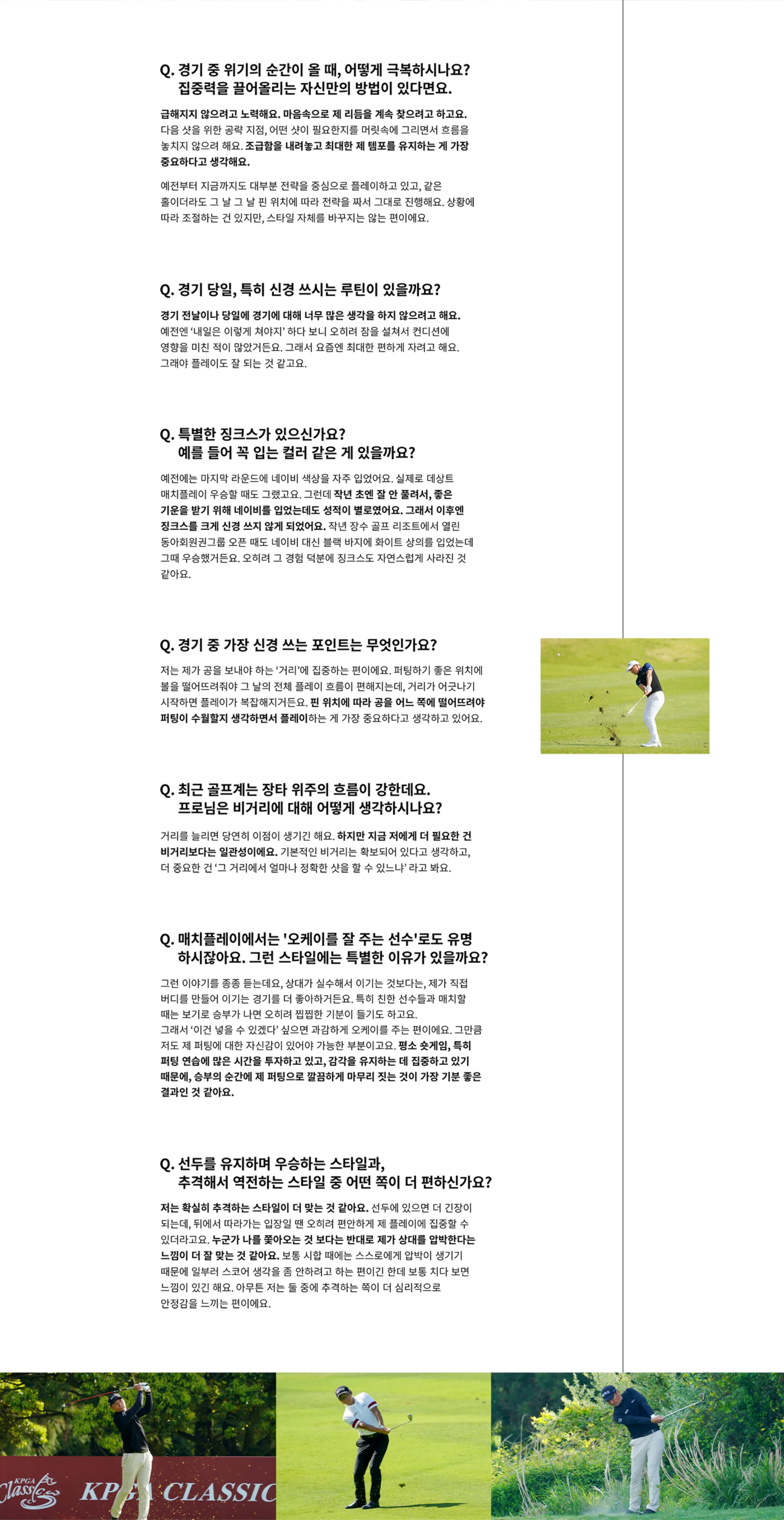 저는 홀마다 전략을 확실히 세우고 플레이하려고 해요. 끊어갈 곳은 분명히 끊고, 가야 할 때는 망설이지 않고 과감하게 공략하는 편이에요. 전체적으로는 전략적인 플레이를 지향하지만, 흐름을 타다 보면 감각적으로 샷을 선택하는 순간들도 자연스럽게 나오는 것 같아요. 그래서 팬분들께서도 그런 모습들을 인상적으로 봐주시는 것 같고요.