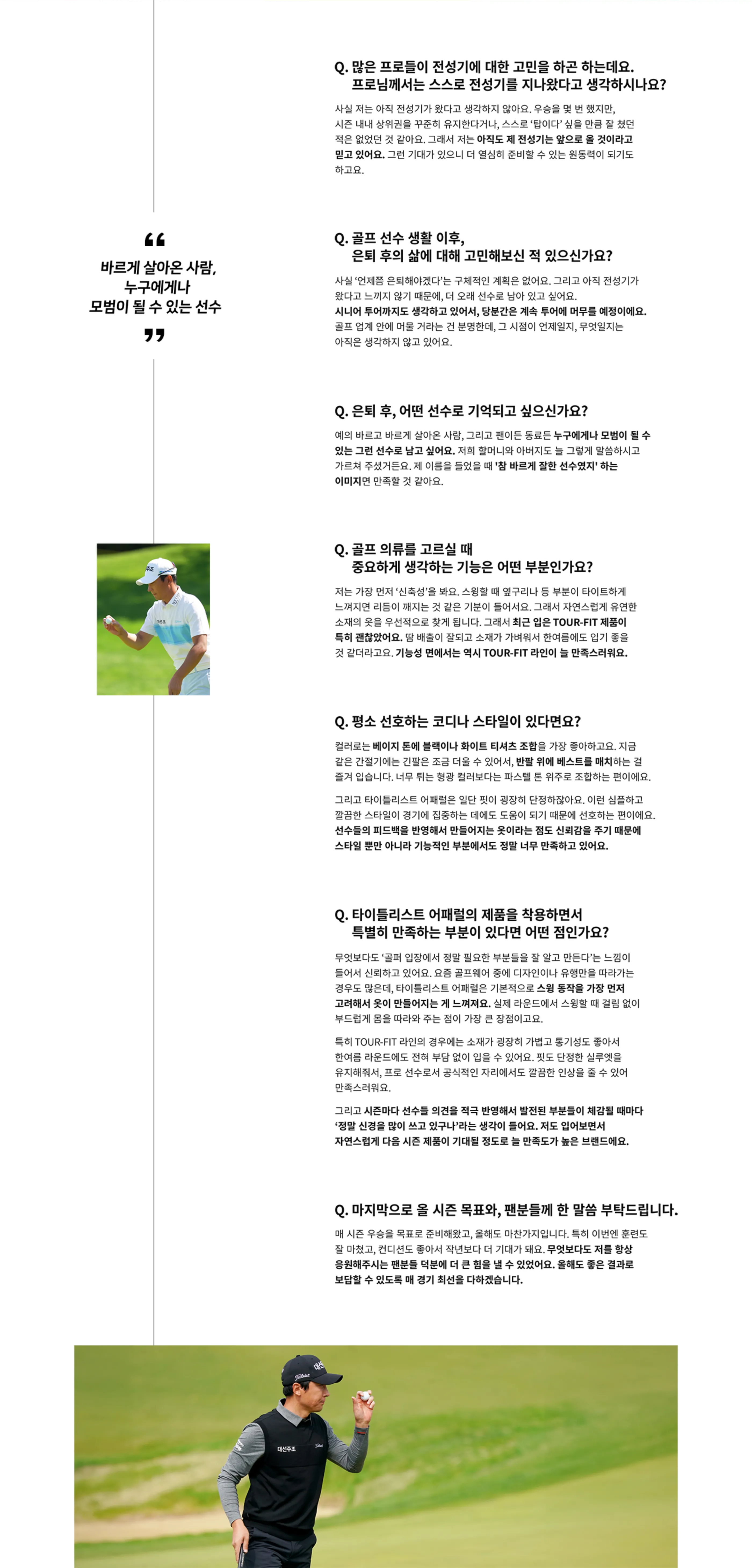 사실 저는 아직 전성기가 왔다고 생각하지 않아요. 우승을 몇 번 했지만, 시즌 내내 상위권을 꾸준히 유지한다거나, 스스로 ‘탑이다’ 싶을 만큼 잘 쳤던 적은 없었던 것 같아요. 그래서 저는 아직도 제 전성기는 앞으로 올 것이라고 믿고 있어요. 그런 기대가 있으니 더 열심히 준비할 수 있는 원동력이 되기도 하고요.