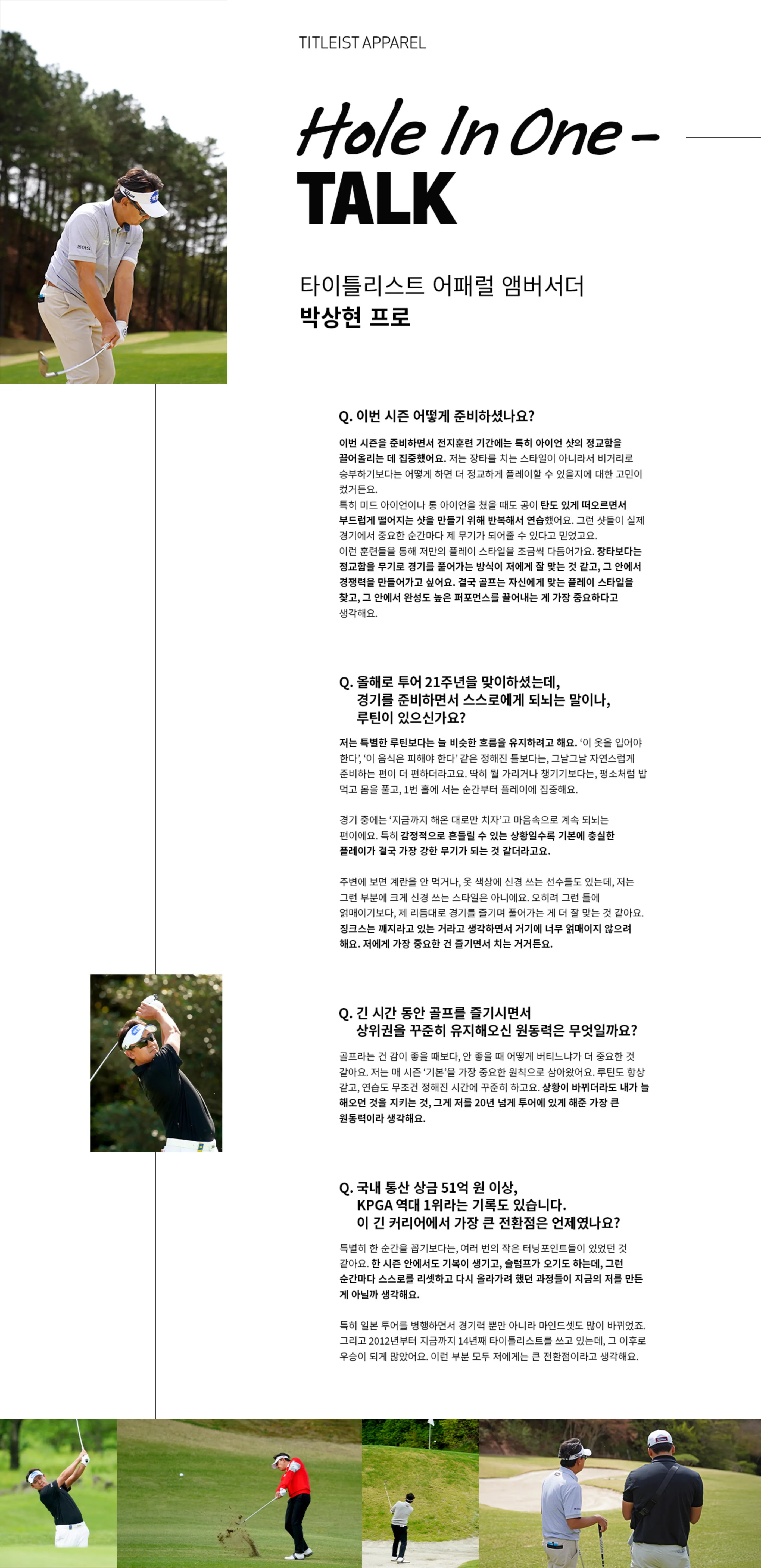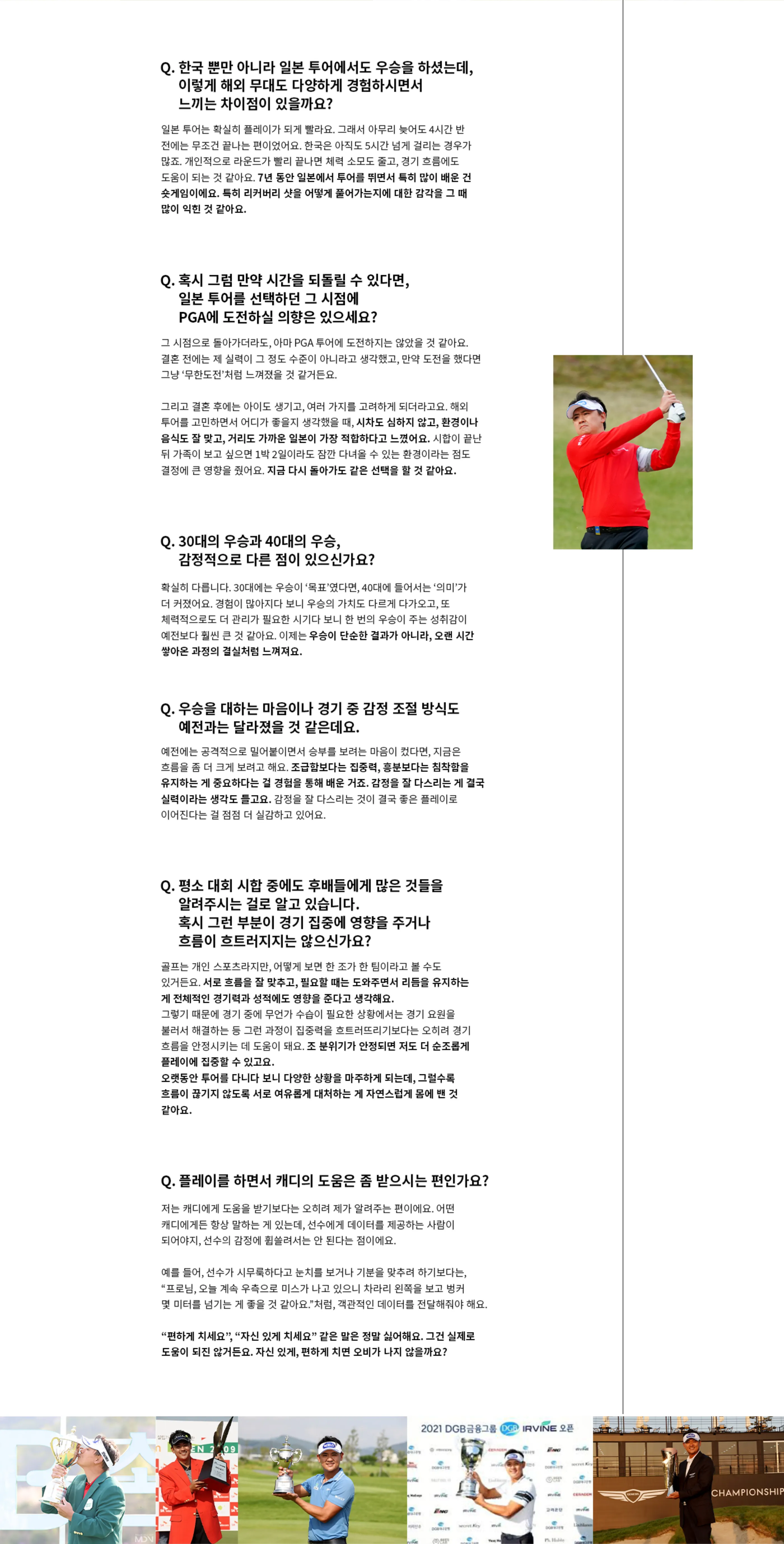 특히 일본 투어를 병행하면서 경기력 뿐만 아니라 마인드셋도 많이 바뀌었죠. 그리고 2012년부터 지금까지 14년째 타이틀리스트를 쓰고 있는데, 그 이후로 우승이 되게 많았어요. 이런 부분 모두 저에게는 큰 전환점이라고 생각해요.