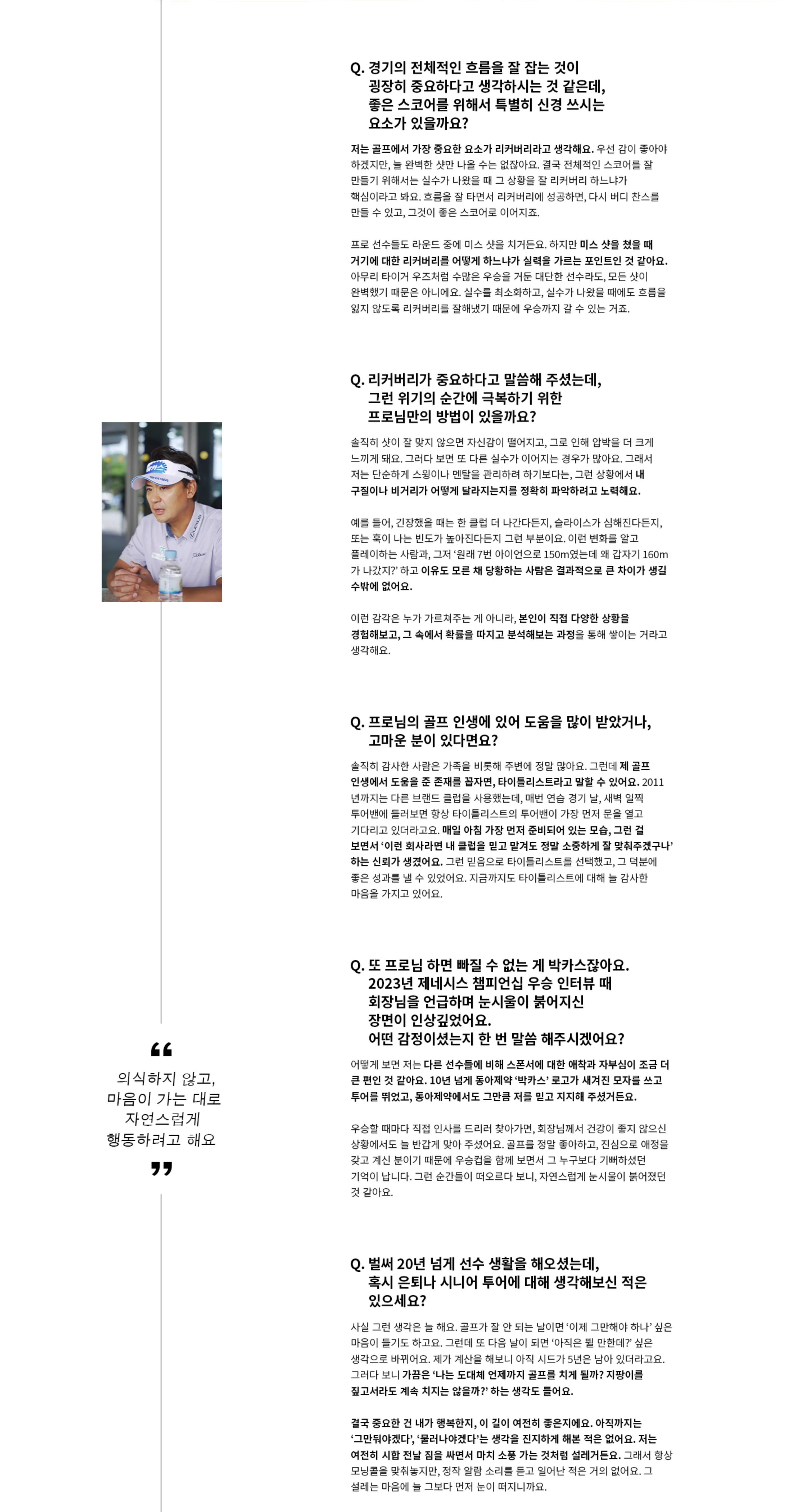 골프라는 건 감이 좋을 때보다, 안 좋을 때 어떻게 버티느냐가 더 중요한 것 같아요. 저는 매 시즌 ‘기본’을 가장 중요한 원칙으로 삼아왔어요. 루틴도 항상 같고, 연습도 무조건 정해진 시간에 꾸준히 하고요. 상황이 바뀌더라도 내가 늘 해오던 것을 지키는 것, 그게 저를 20년 넘게 투어에 있게 해준 가장 큰 원동력이라 생각해요.