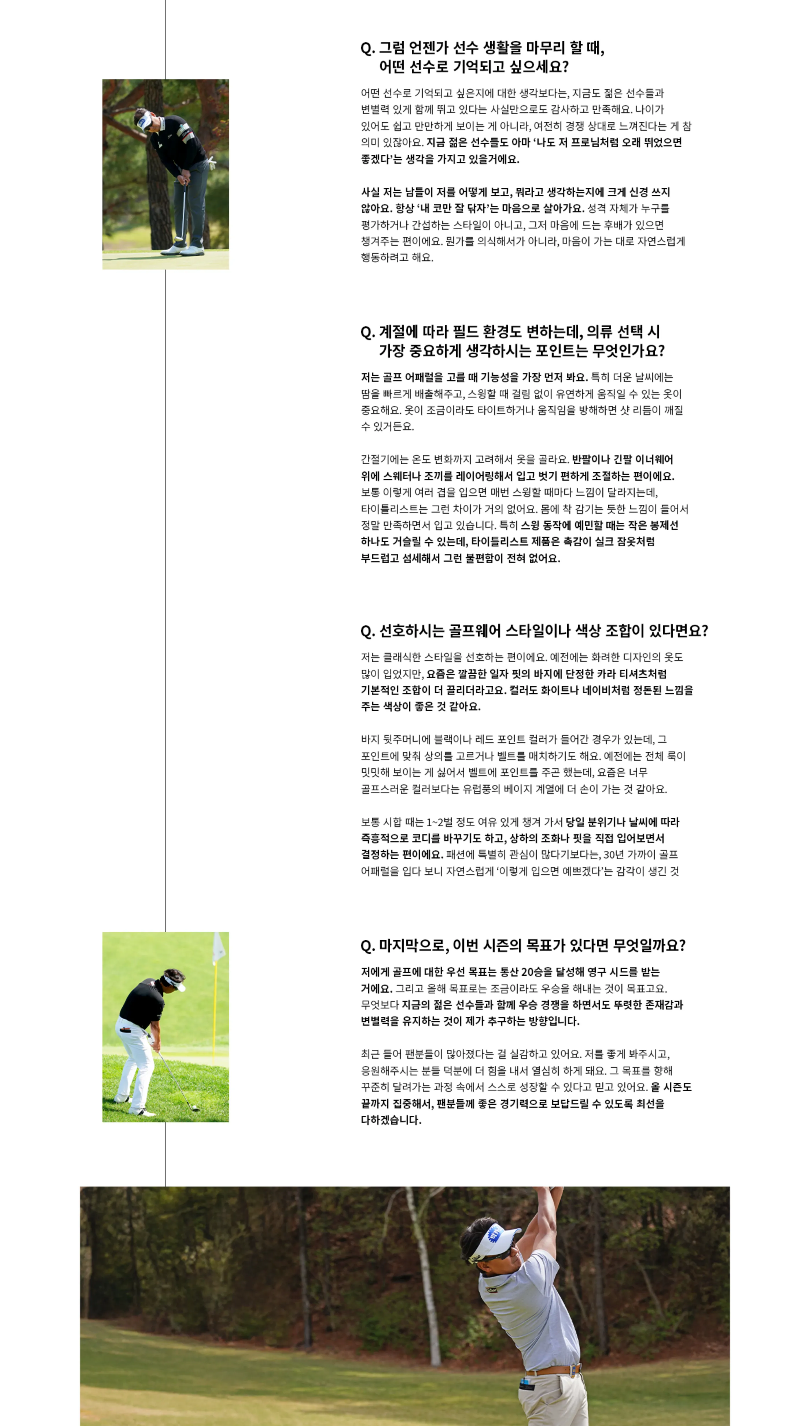 저에게 골프에 대한 우선 목표는 통산 20승을 달성해 영구 시드를 받는 거에요. 그리고 올해 목표로는 조금이라도 우승을 해내는 것이 목표고요. 무엇보다 지금의 젊은 선수들과 함께 우승 경쟁을 하면서도 뚜렷한 존재감과 변별력을 유지하는 것이 제가 추구하는 방향입니다.